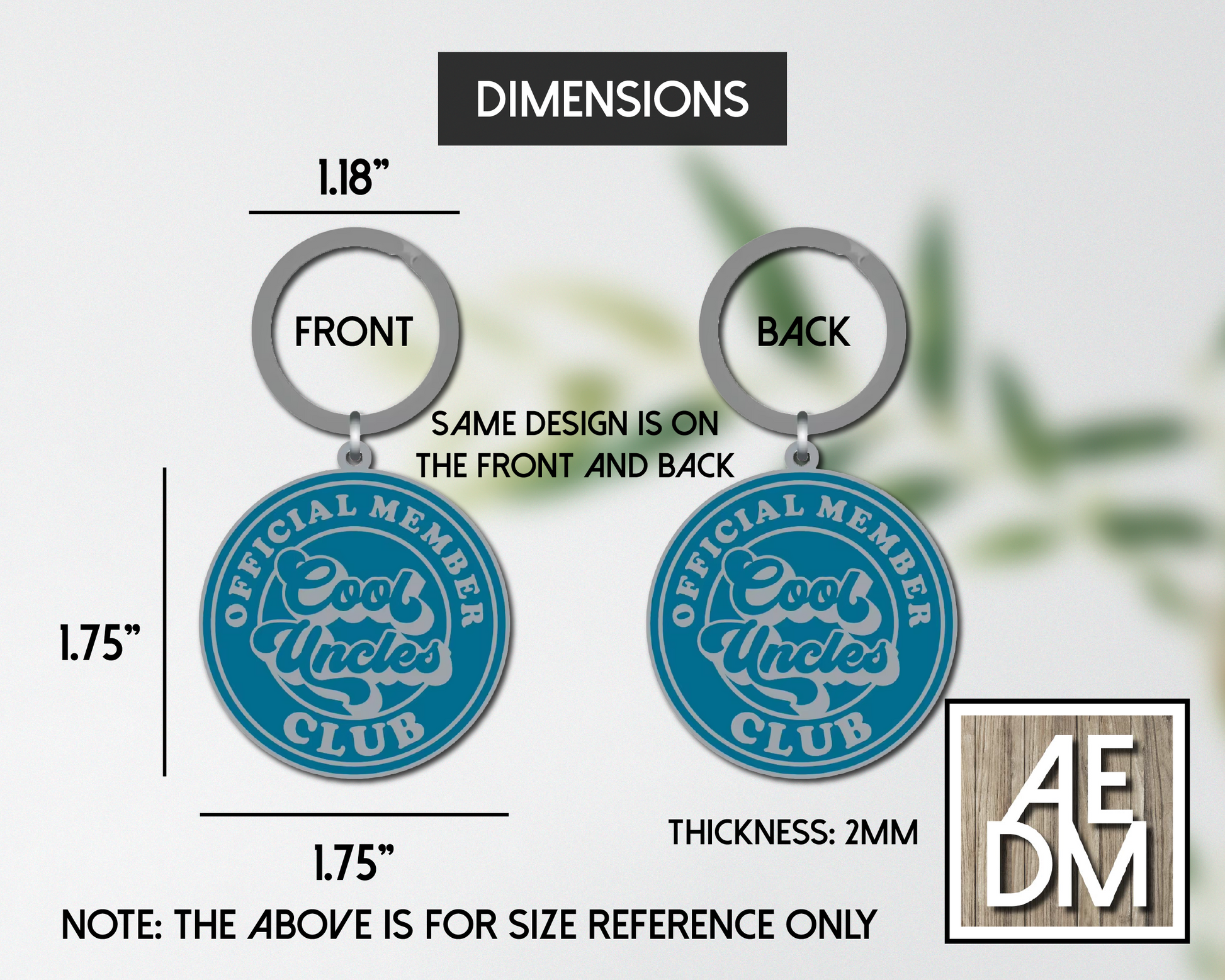 • Dimensions: 1.75" keychain, 1.18" keyring, 2mm keychain thickness